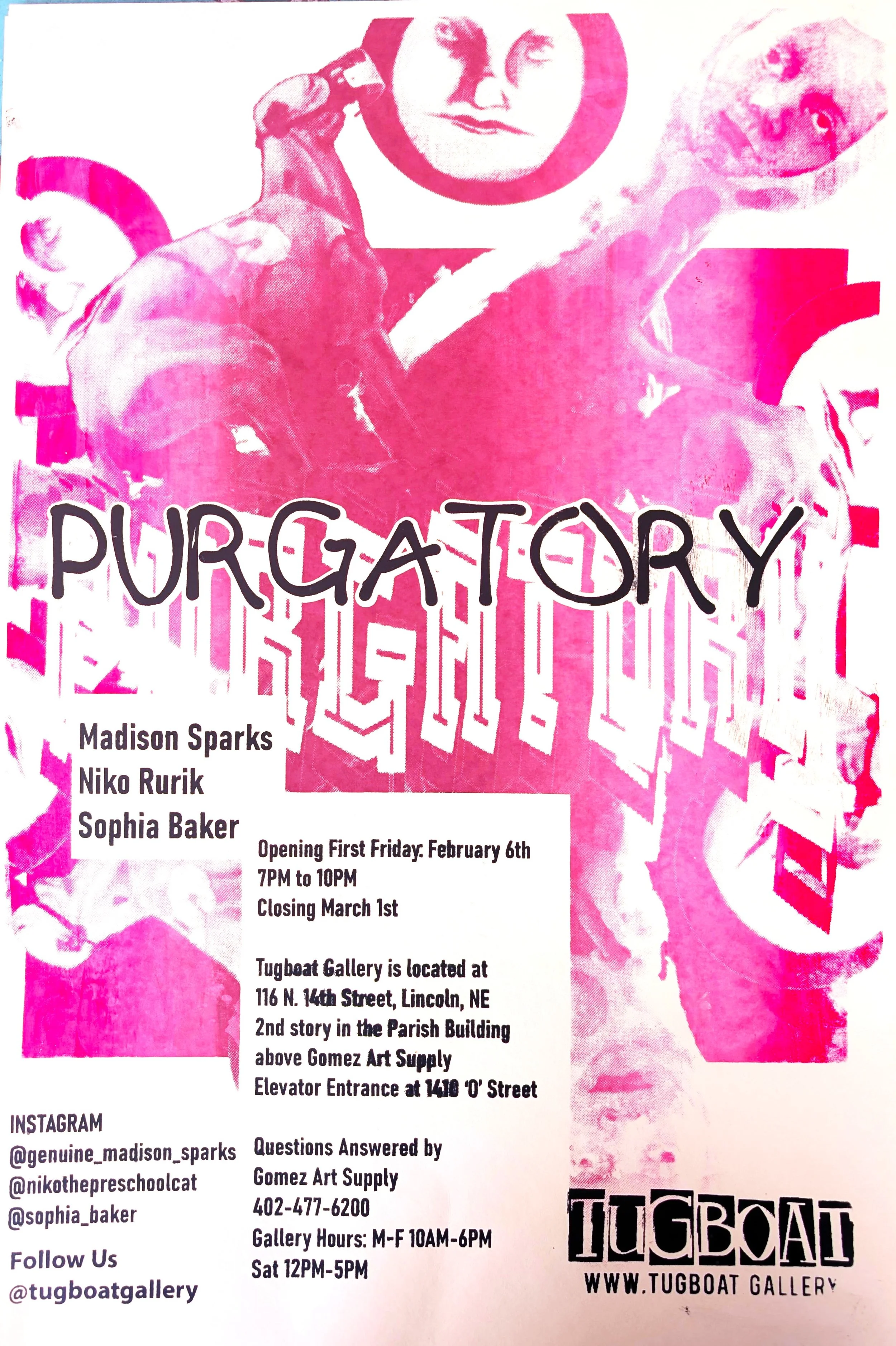 Visitation to Tugboat and the Parish Studios is facilitated by Gomez Art Supply located on 120 N. 14th St. of Downtown Lincoln. Call ahead at 402-477-6200. Open M-F 10AM-6PM, Sat 12PM-5PM, and Sun 2PM-5PM (just ask for the keys). Follow us on our socials for announcements and updates.
